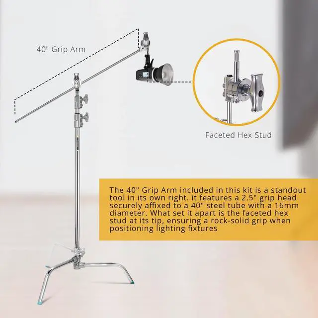 Included in this kit is a 40" Grip Arm, engineered to offer you the ultimate creative freedom. Attached to this arm is a robust 2.5" Grip Head, designed to support your flags, diffusers, or other modifiers with ease and reliability. In essence, the Flashpoint 40 Quick Release Sliding Leg C-Stand Kit is a marvel of craftsmanship, designed to take your photography and videography to the next level. Its unique features, such as the sliding leg and substantial grip arm, make it an essential tool for both professionals and hobbyists.