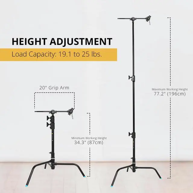 At its heart, the kit includes a two-section double riser with a detachable base, a 20" Grip Arm, and a 2.5" Grip Head. It's a comprehensive solution for positioning your lighting and grip gear with unmatched accuracy and ease. The Quick Release Turtle Base C-Stand is a standout feature of this kit. This 20" Century Stand is designed to provide unwavering support for light fixtures and modifiers, with an impressive load capacity of up to 22 lb. The stand's sleek black finish is achieved through a precise application of black powder coating to its robust metal frame.