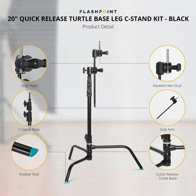 When it comes to professional film and video production, the Flashpoint 20" Quick Release Turtle Base C-Stand Kit with 2.5" Grip Head & 20" Grip Arm (Black) stands as an essential tool, designed to streamline your workflow and elevate your creative output. This sleek, black-finished kit is more than just a piece of equipment; it's a symbol of your dedication to delivering excellence in every frame. The Flashpoint C-Stand Kit is an industry icon, meticulously crafted to withstand the rigorous demands of professional use. This kit is the epitome of versatility and precision, providing you with the tools to realize your creative vision on set.