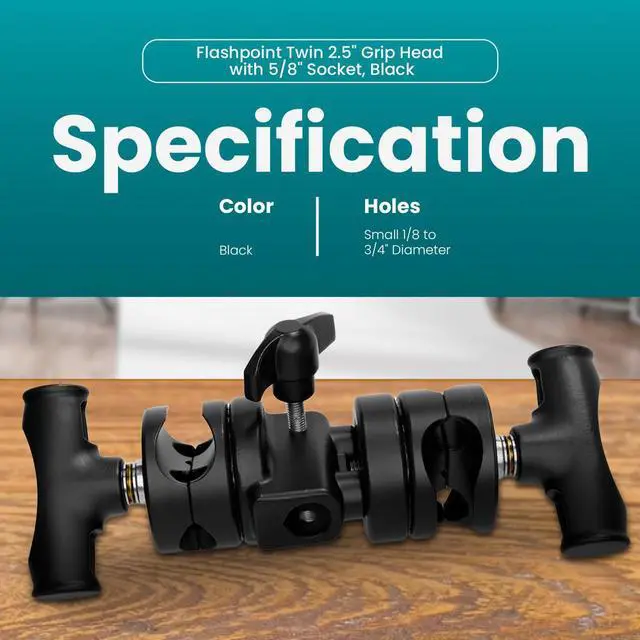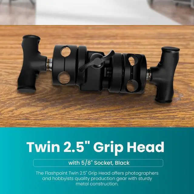 The Flashpoint Twin 2.5" Grip Head with 5/8" Socket can be mounted on a stand or grip arm. The holes in the twin grip heads are used to mount arms, studs, and other accessories onto light stands. The rotating grip heads allow you to position your accessories at any angle you require. Small diameter holes work on shafts from 1/8 to 3/4" diameter.