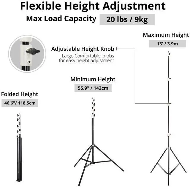 Despite its heavy-duty design, the Flashpoint 13' Pro Air Cushioned Light Stand remains lightweight and easy to transport, thanks to its high-quality, lightweight materials. This stand is designed to support the maximum weight with minimal strain on your back, making it an ideal choice for photographers and videographers on the go.