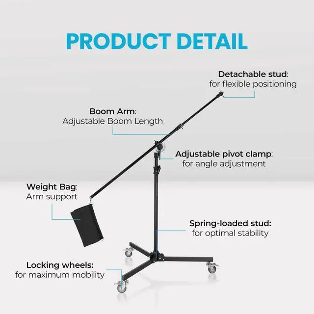 Overcome the challenges of dynamic photography and videography with the Flashpoint 12.8 ' Folding Wheeled Base Stand with Boom Arm. Designed for professionals who demand precision and flexibility, this stand offers unparalleled mobility, ensuring you capture the perfect shot every time. Constructed from durable, long-lasting steel, it supports up to 5 kg, allowing you to focus on your creative vision without worrying about equipment stability. The stand's innovative design includes smooth-rolling wheels, enabling effortless movement across various surfaces, making transitions between settings seamless. When your session concludes, the stand conveniently folds down to a compact 46 inches, ensuring easy portability and storage.