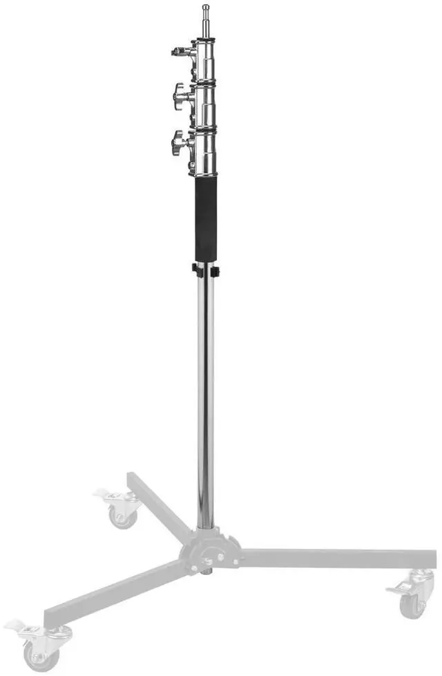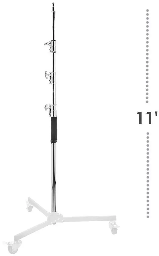 The Flashpoint 11' Century C Stand Center Column is the main player in constructing a custom made C Stand or replacing a time-honored C Stand center column. All steel durable tubular riser sections extend from 51" to 132" with a baby pin on top, are spring loaded for safety and join at an aluminum nexus with generous wing locking knobs. The sheer strength of the pillar secures light fixtures exceeding 30 pounds, depending on the options of adding a collapsible wheeled Roller Stand base or the traditional 'Turtle Base' that provides an exceptionally low center of gravity.