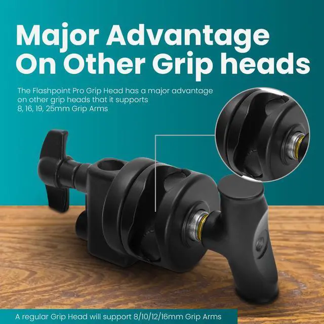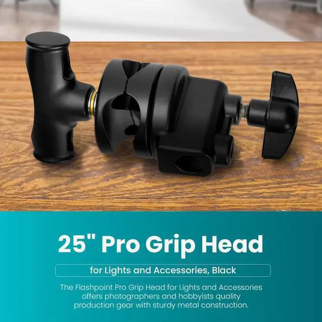 The Flashpoint Pro Grip Head for Lights and Accessories - 2.5" Diameter mounts lights, light modifiers, scrims, flags, cutters, and other lighting accessories onto C-stands or butterfly frames. When trying to get the perfect shot, you often have various lighting accessories such as flags, scrims and cutters set up around your subject. A grip head holds each in a precise position, making it a crucial piece of equipment on most any set.