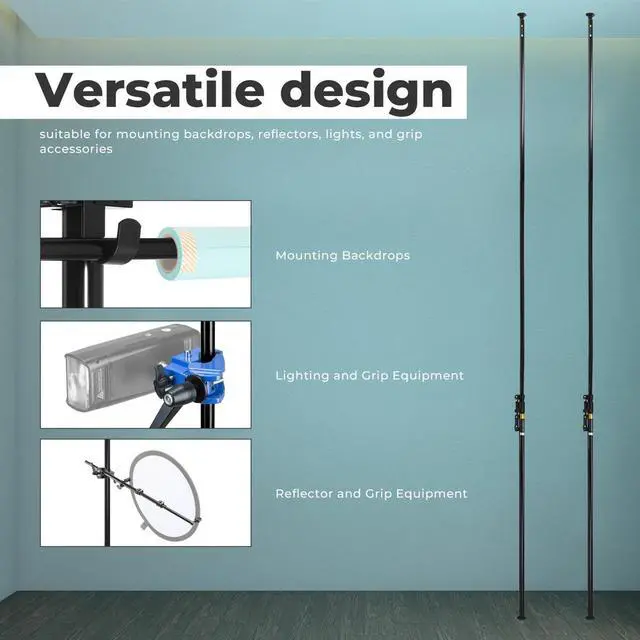 The Telepole Support System is designed for versatile use, attaching seamlessly to the floor, ceiling, or wall. When used in a horizontal orientation, the Telepole Extension can also serve as a background crossbar, adding another layer of functionality to your setup. Available in a 59" ( 1.5 m) length and finished in a professional black, the Telepole Extension is not only practical but also aesthetically pleasing. The assembly of the Telepole Extension is straightforward and user-friendly. Simply remove the spring-loaded tube from the top of the Telepole, insert the narrow end of the Telepole Extension, and replace the Telepole's tube.