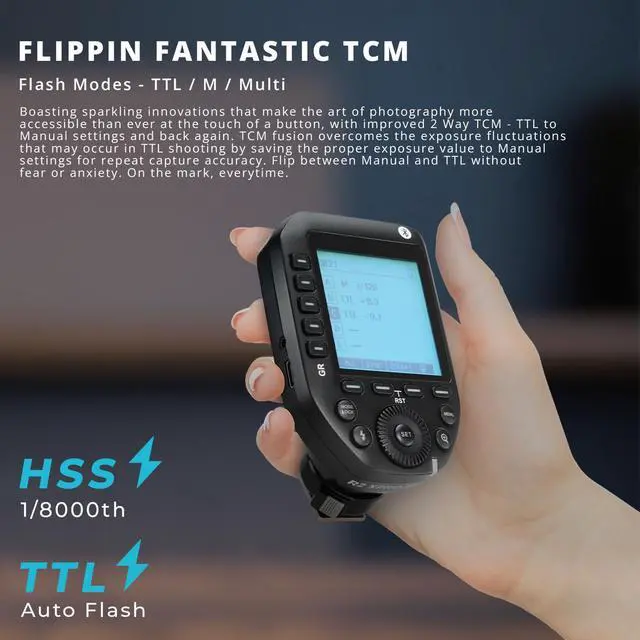 Designed for the active professional, this device offers dynamic, direct access, and precise control over every aspect of the linked Fujifilm TTL flash. Its wide range of capabilities caters to every strobist on the quest for lighting excellence, ensuring confident handling and precise control. The improved 2 Way TCM - TTL to Manual settings and back again, allows you to flip between Manual and TTL without fear or anxiety. The R2 XPro II flash trigger also offers exceptionally stable signal broadcast, direct info access with the brilliant backlit dot matrix LCD screen, displaying all 5 Groups simultaneously.