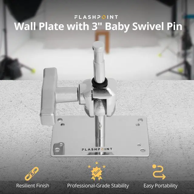 When it comes to enhancing your production capabilities, the Flashpoint Wall Plate with a 3" Baby Swivel Pin stands out as an indispensable tool for both professional studios and on-location shoots. This robust and versatile accessory is centered around a 3" swiveling pin with a 5/8" industry-standard diameter, offering unmatched compatibility with a wide range of lighting equipment. Unlike ordinary wall plates, the swivel pin on the Flashpoint model is welded to the base, a design choice that guarantees superior strength and durability. This feature ensures the wall plate can withstand the demands of any production environment, making it a long-lasting addition to your equipment arsenal.