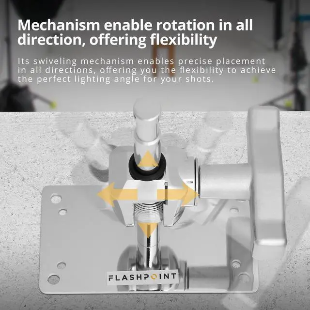 Constructed from chrome-plated steel, the Flashpoint Wall Plate is more than just a tool - it's a symbol of resilience and longevity. It provides a reliable foundation for your lighting setups, ensuring your equipment remains stable and secure throughout your shoots. The wall plate's user-friendly design includes a large locking T-handle, allowing you to confidently secure your lighting gear in place. Its swiveling mechanism offers precise placement in all directions, giving you the flexibility to achieve the ideal lighting angle for every shot. Say farewell to cumbersome light stands and embrace this space-saving alternative.