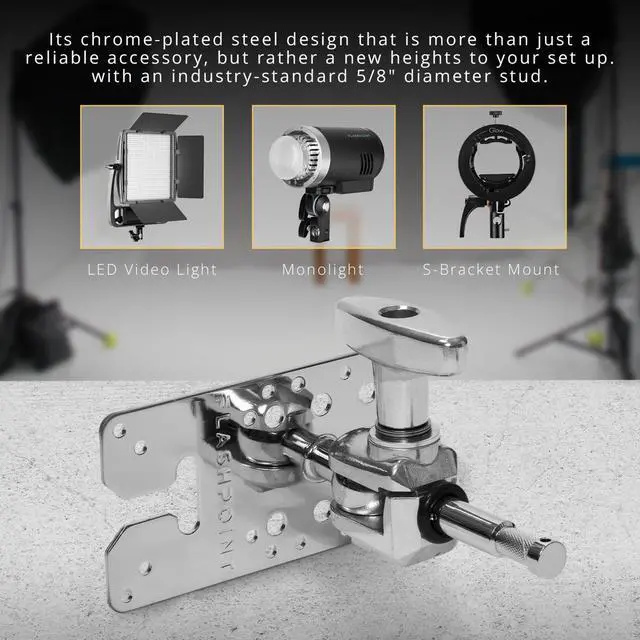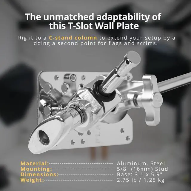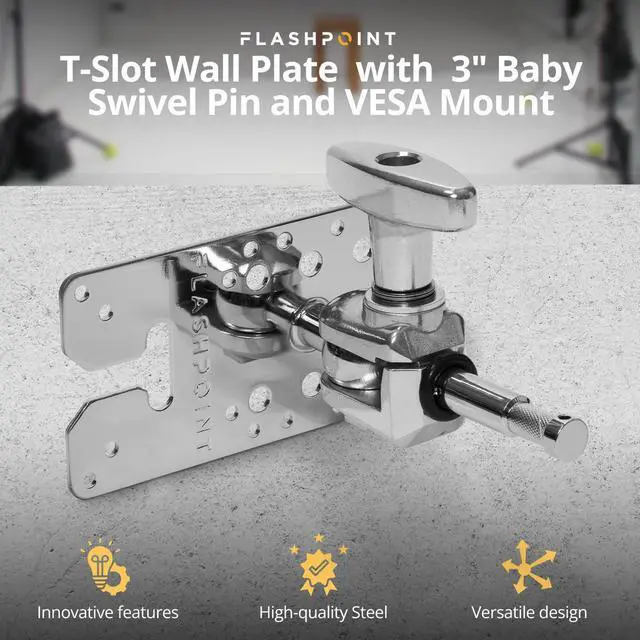 The precision-engineered ball joints offer a range of positioning options, ensuring maximum flexibility and accuracy. In essence, the Flashpoint T-Slot Wall Plate with a 3" Baby Swivel Pin and VESA Mount is more than just a mounting solution. It's a sturdy base that supports your artistic vision, whether you're lighting an impromptu outdoor setup or orchestrating a professional studio production.