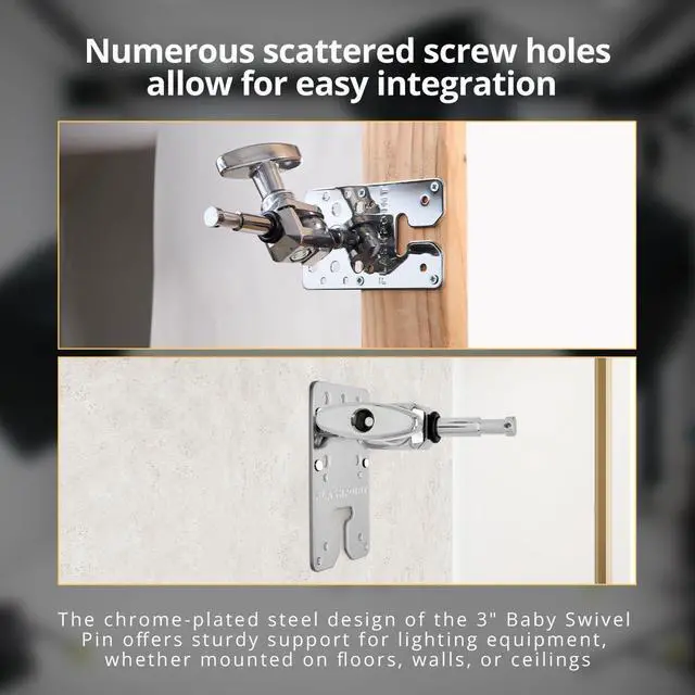 It elevates your setup, providing a secure fit for a wide range of lighting equipment, thanks to its welded design for extra strength and a 5/8" industry-standard diameter. The Baby Swivel Pin's versatility extends to its mounting capabilities, whether on floors, walls, ceilings, or even temporarily attached to apple boxes or the floor with gaffer tape. A safety wire hole reinforces the pin, adding an extra layer of security and preventing production-related mishaps. The VESA mount enhances this exceptional combination, featuring a ratcheting lever that can be adjusted for complete and safe locking, even in the tightest spaces.