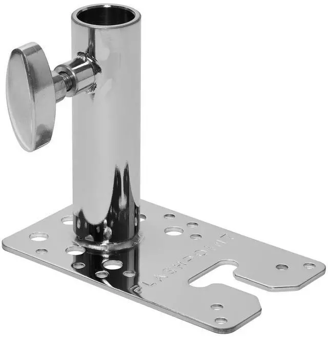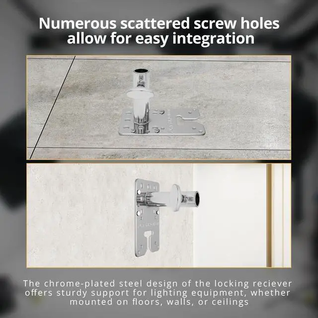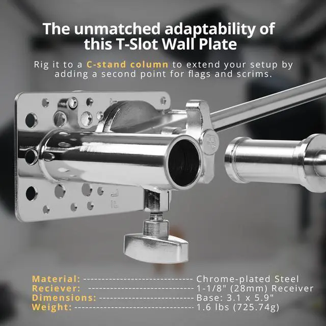 Whether you're mounting microphones above talent, setting up cameras for tabletop shooting, or extending your setup with a C-stand column, this wall plate offers a flexible solution. Its numerous screw holes allow for easy integration into apple boxes, wooden beams, or other surfaces. For those seeking precision, the plate includes machined guide notches along its side, enabling accurate 45-degree mounting for perfect execution. The 1-1/8" Locking Receiver, with its chrome-plated steel design, adds reliability and elevates your setup to new heights. The innovative design of the 1-1/8" Locking Receiver transforms this wall plate into a multi-functional platform, capable of accommodating speakers, monitors, and other equipment.