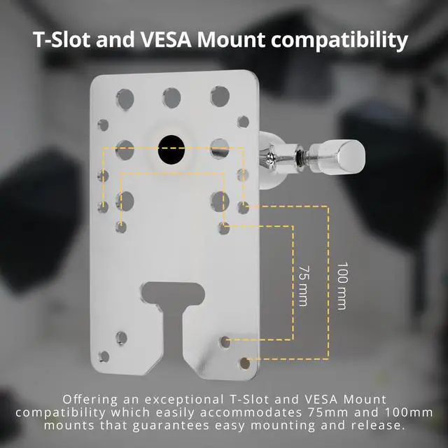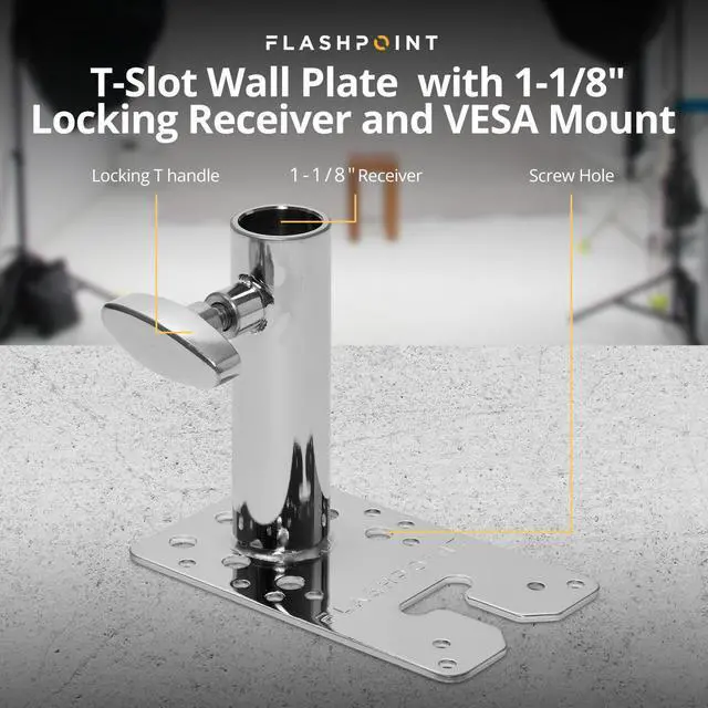 If you're seeking a versatile solution for your mounting needs, look no further than the Flashpoint T-Slot Wall Plate with 1-1/8" Locking Receiver and VESA Mount. This multi-functional wall plate offers unparalleled adaptability, designed to exceed your expectations and meet a wide range of equipment requirements. The T-Slot Wall Plate features strategically placed holes, accommodating a diverse array of gear. Its compatibility with both T-Slot and VESA 75mm Mount systems, ensures easy equipment mounting and release. This feature not only enhances convenience but also expands your creative possibilities, making it an ideal choice for challenging, space-restricted locations.