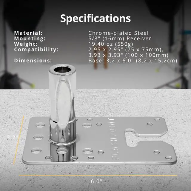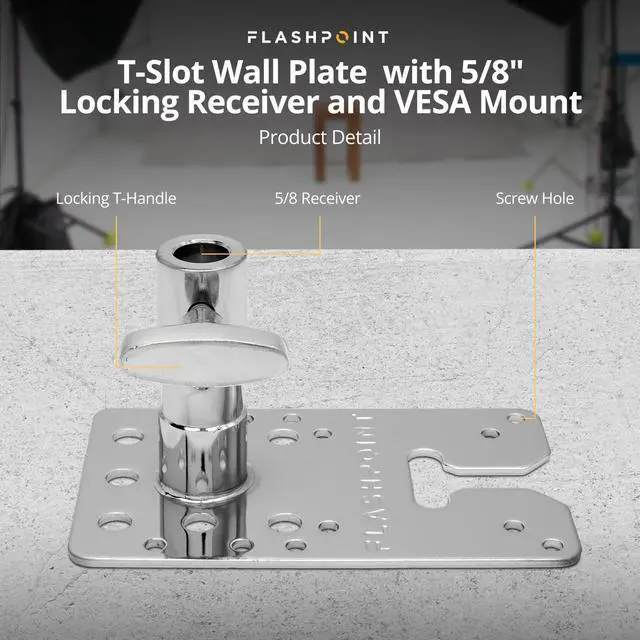 Enhance your creative potential with the Flashpoint T-Slot Wall Plate, featuring a 5/8" Locking Receiver and VESA Mount. This versatile wall plate is meticulously designed to exceed your expectations, offering unmatched adaptability for a wide range of equipment. The strategically positioned holes on this innovative plate accommodate various setups, making it an ideal choice for both professional and amateur photographers and videographers. The T-Slot Wall Plate's compatibility with T-Slot and 75 mm VESA Mounts, ensures easy mounting and release. This feature makes it an excellent solution for working in tight spaces, whether you're mounting microphones above talent, setting up cameras for tabletop shooting, or extending your setup with a C-stand column for flags and scrims.