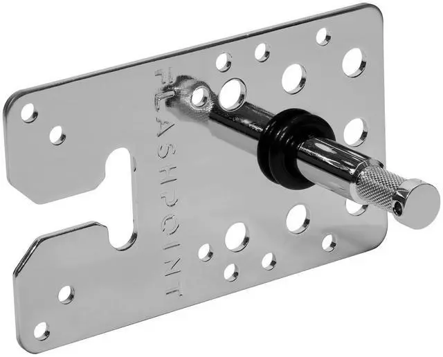 It's perfect for working in tight spaces, offering a flexible solution for mounting microphones above talent, setting up cameras for tabletop shooting, or extending your setup by adding a second point for flags and scrims on a C-stand column. The numerous scattered screw holes make it easy to integrate into apple boxes, wooden beams, or other surfaces. For those who value precision, Flashpoint has included machined guide notches along the plate's side, ensuring accurate 45-degree mounting for flawless execution. The 3" Baby Pin, a key feature of this product, is more than just a reliable accessory.