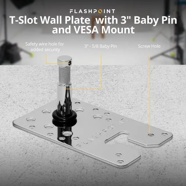 Are you seeking a versatile and adaptable solution for your mounting needs Look no further than the Flashpoint T-Slot Wall Plate with a 3" Baby Pin and VESA Mount. This innovative product offers a unique blend of functionality and adaptability, designed to exceed your expectations and meet a wide range of equipment requirements. The T-Slot Wall Plate features strategically placed holes, providing compatibility with a broad spectrum of equipment. It boasts an exceptional T-Slot and VESA Mount compatibility, effortlessly accommodating 75mm mounts for easy mounting and release. This product isn't just about convenience; it's designed to unlock your creative potential.