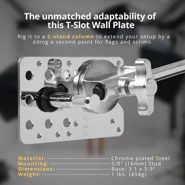 Its chrome-plated steel design takes your setup to new heights. Whether mounted on floors, walls, ceilings, or temporarily attached to apple boxes or the floor with gaffer tape, its versatile design is welded for extra strength, ensuring a secure fit for a wide range of lighting equipment. The safety wire hole reinforces the 3" baby pin, adding extra security and preventing production-related mishaps. This wall plate's versatility extends beyond its mounting capabilities, offering increased options for your creative endeavors. Whether you're lighting an impromptu outdoor setup or setting up lighting for a professional studio production, this wall plate provides a sturdy base ready to support your artistic vision.
