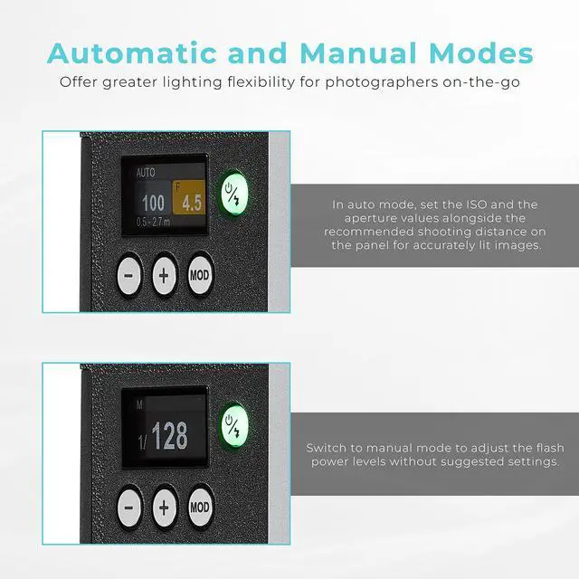 The Flashpoint iA32 features a reliable single-contact hot shoe mount, ensuring seamless connectivity with most camera models. Switch between Manual Mode for precise control or Auto Mode for intelligent adjustments that adapt to your shooting conditions, making it suitable for photographers of all skill levels.
