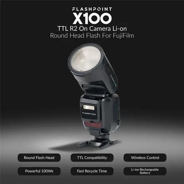 The Flashpoint X100 TTL R2 is engineered to deliver exceptional lighting with its round flash head, providing soft, natural illumination that enhances any scene. With a robust 100Ws output, this flash ensures comprehensive coverage for a variety of shooting scenarios, from portraits to events and studio work. Seamlessly integrating with FujiFilm camera systems, it offers TTL compatibility and wireless control via 2.4G transmission, allowing for effortless adjustments and fast recycling times. The built-in modeling lamp and intuitive touch screen make it easy to fine-tune flash power in manual mode, while the long-lasting Li-ion battery (7.2V, 2980mAh) supports up to 400 full-power flashes per charge, ideal for extended shooting sessions. Advanced wireless functionality enables operation across multiple groups and channels, providing versatility and creative lighting control.