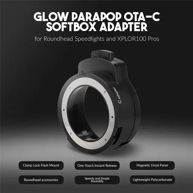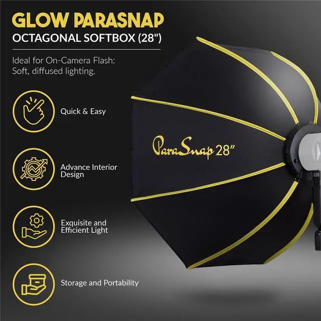 Complementing the flash is the Glow PS-B28K ParaSnap Octagonal Softbox, a must-have for photographers seeking efficiency and superior lighting quality. Featuring Glow's proprietary SterlingFibre Silver Lining, this softbox maximizes light efficiency, ensuring subjects are illuminated with brilliance and precision. Its compact 28-inch size and rapid setup mechanism allow for quick deployment, making it perfect for both studio and on-location shoots. The octagonal shape produces even lighting and round catchlights, adding a professional touch to your images. The silver interior amplifies light output, while the removable inner and outer diffusers create a soft, consistent beam, free of hot spots.