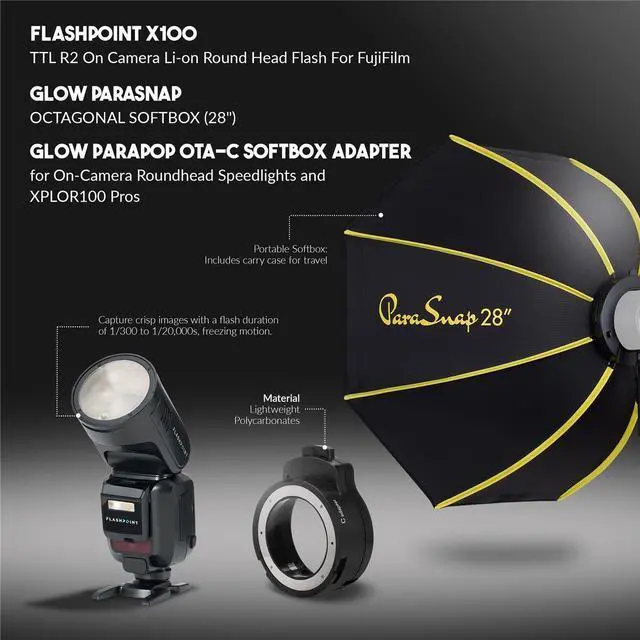 Experience unparalleled lighting precision and flexibility with the Flashpoint X100 TTL R2 On-Camera Li-ion Round Head Flash for FujiFilm, paired with the Glow PS-B28K ParaSnap Octagonal Softbox (28"). This dynamic duo is crafted for both professional photographers and passionate enthusiasts who demand superior performance and creative control in their lighting setups.