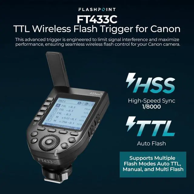 For photographers seeking to elevate their lighting setup, the Flashpoint FT433C TTL Wireless Flash Trigger for Canon is an essential tool designed to limit interference and maximize performance. This advanced trigger operates on a 433 MHz radio frequency, offering a robust 328-foot range that provides a reliable alternative to the commonly used 2.4 GHz band. This makes it an ideal choice for sports, wildlife, and photojournalism, where uninterrupted performance is crucial. The FT433C is fully compatible with Canon's TTL system, supporting high-speed sync (HSS) up to 1/8000 of a second.