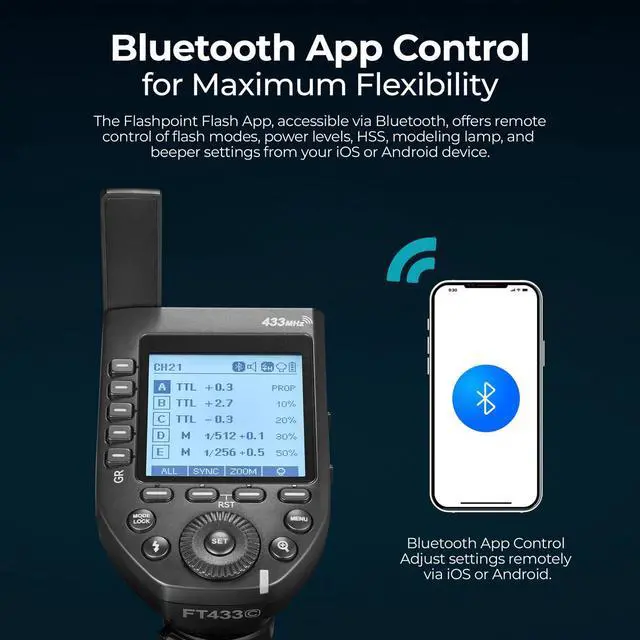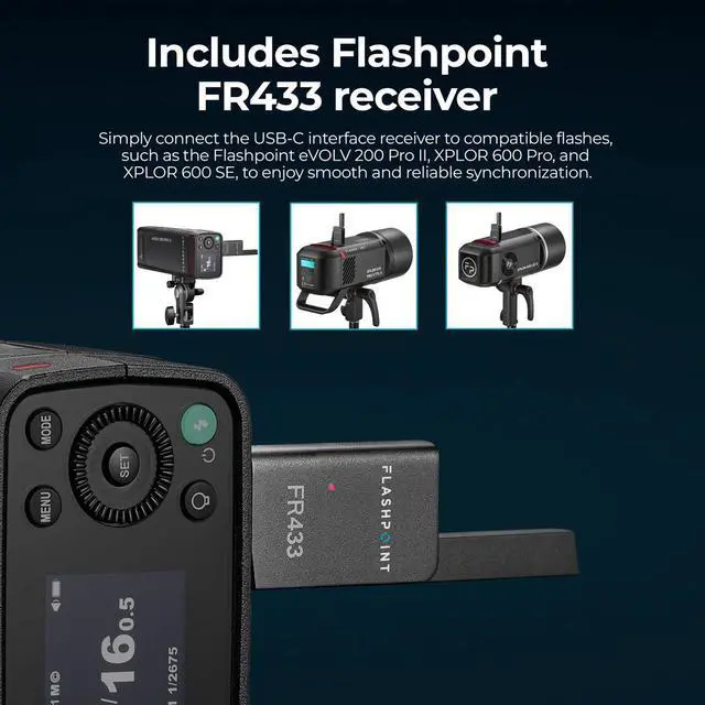 By connecting the USB-C interface receiver to compatible flashes such as the Flashpoint eVOLV 200 Pro II, XPLOR 600 Pro, and XPLOR 600, photographers can enjoy smooth and dependable synchronization. The FT433C is equipped with smart onboard controls, including a large LCD screen with five group buttons and four function keys for quick and intuitive adjustments. Additionally, the Flashpoint Flash App, accessible via Bluetooth, allows remote control of flash modes, power levels, HSS, modeling lamp, and beeper settings from any iOS or Android device. For photographers who need to switch quickly from TTL to manual mode, the TCM (TTL Converted to Manual) function offers a one-click solution.