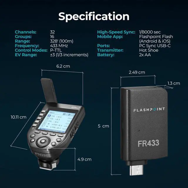It offers versatile lighting control with auto TTL, manual, and multi-flash modes, along with front and second curtain sync, ensuring precise and adaptable lighting solutions for any shooting scenario. With its 433 MHz frequency, the FT433C minimizes interference from nearby systems, making it perfect for studio shoots, sports events, and conferences. It features 32 channels and 99 ID settings, supporting five or 16 group selections for efficient multi-light setups, ensuring reliable wireless synchronization. This shoe-mounted trigger pairs effortlessly with select flashes equipped with the included FR433 receiver.