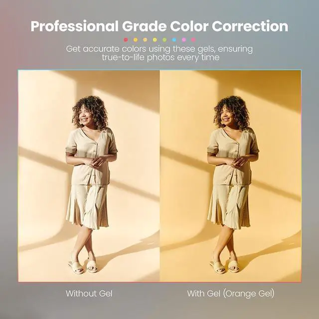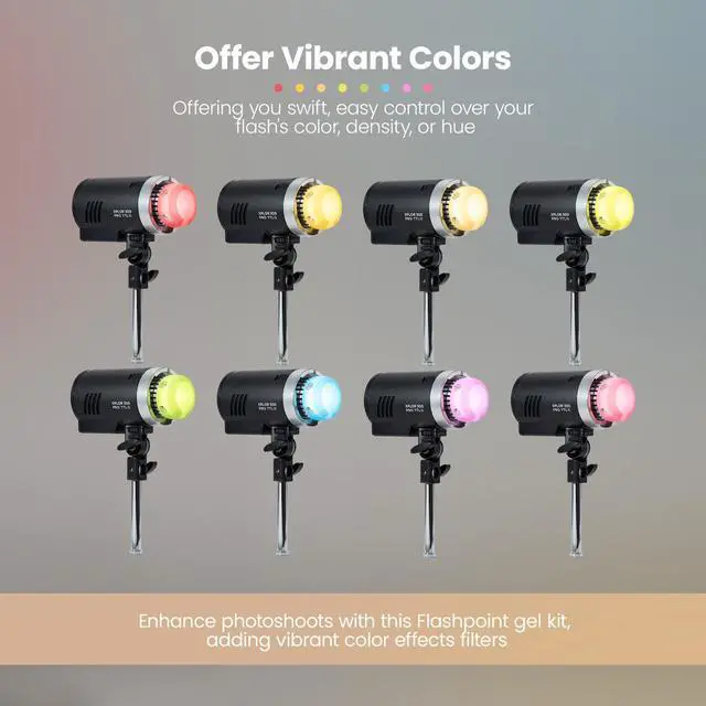 They set up and come off easily and store flat when not in use. Two high-temp bands are included. The gel colors are red, orange, yellow, green, teal, blue, purple, and magenta. Unlike flimsy film gels, this is made of silicone and designed to last a lifetime. This strength improvement is something you will always look for. With the Flashpoint Silicone Gel Kit, you'll always have the right color correction, not just a generic warming gel.