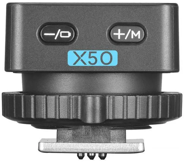 The X5O features a minimalist design, omitting a physical power switch in favor of color-coded status indicators. It is powered by an internal 100mAh lithium battery that charges in approximately three hours when docked with the iT32. For convenience, the trigger's battery level can be monitored directly through the iT32's flash menu when the two units are attached. Once fully charged, it offers an impressive 16 hours of operational life. Attachment is characterized by simplicity and innovation at the same time. The magnetic interface on the bottom of the iT32 allows the X5O to attach automatically and securely.