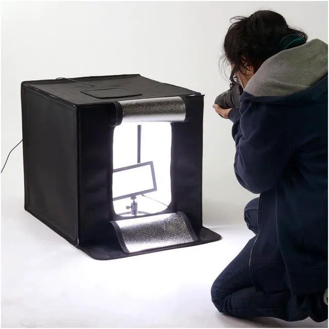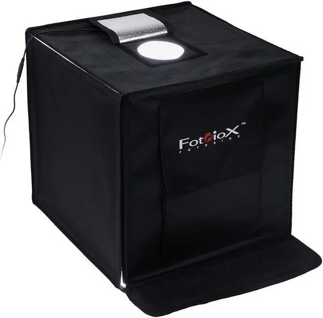 The reflective side panels not only prevent light from escaping but also contribute to maintaining a well-diffused and balanced light environment within the box. This easy-to-use photography studio simplifies your lighting setup, eliminating the need for multiple lights, stands, and cords. It's ready to go right out of the box, making it an ideal choice for photographers on the go. In addition to its standard features, the LED Studio-in-a-Box also includes a shoot-through hatch on the top panel, offering the opportunity for creative, unconventional shooting angles. An optional front panel with another shoot-through hatch can be folded up to prevent glare, enhancing the versatility of this comprehensive photography solution.