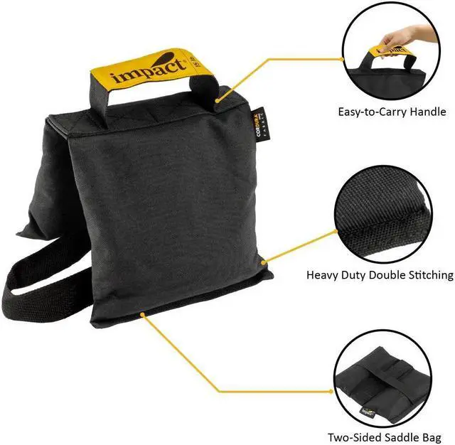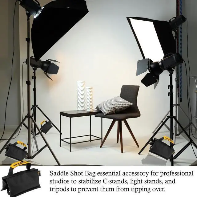The Impact SSB-15 Saddle Shot Bag is a vital accessory for both home and professional studios, designed to stabilize C-stands, light stands, and tripods to prevent tipping. Weighing 15 lb, this shot bag features a dual-wing saddle design that drapes over light stand legs for optimal balance and stability during shoots.