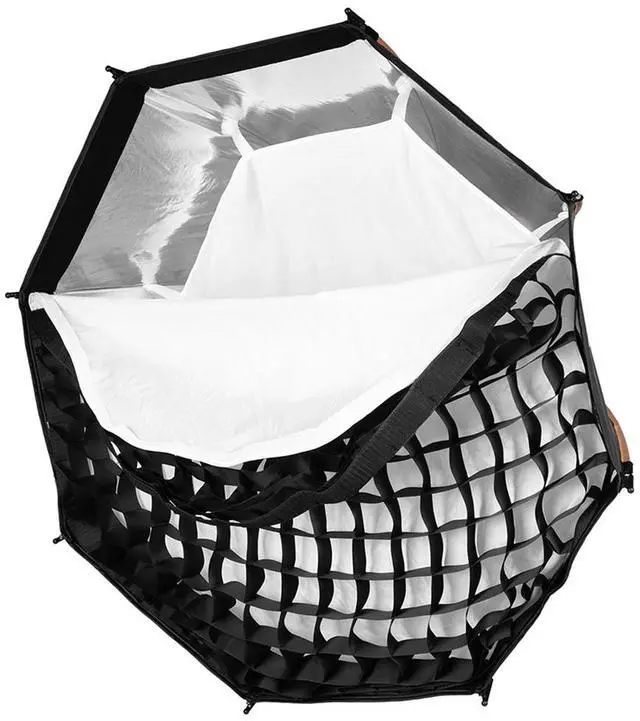 Its adaptability extends to other brands that utilize the Bowens mount, making it a versatile tool for photographers and videographers who require reliable point light sources. The softbox incorporates a cutting-edge quick-release structure, allowing for effortless installation and disassembly. With a single-click operation, users can swiftly set up or pack away the softbox, enhancing efficiency during shoots. Included with the softbox is a 45-degree honeycomb grid, meticulously designed to control light spread and provide precise lighting effects, catering to diverse creative needs. Constructed from industrial-grade soft light materials and high-reflective coatings, the LA-O90 Octagonal Softbox ensures optimal light diffusion and minimal light loss.