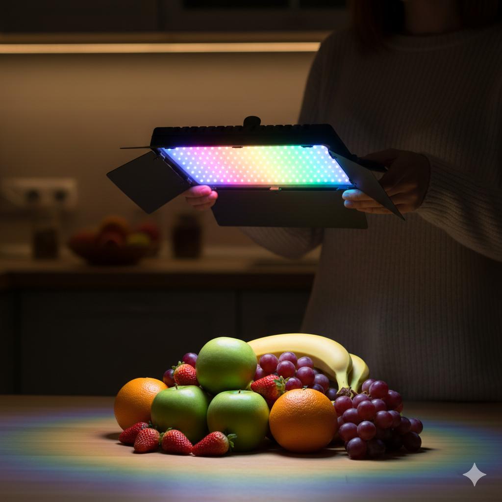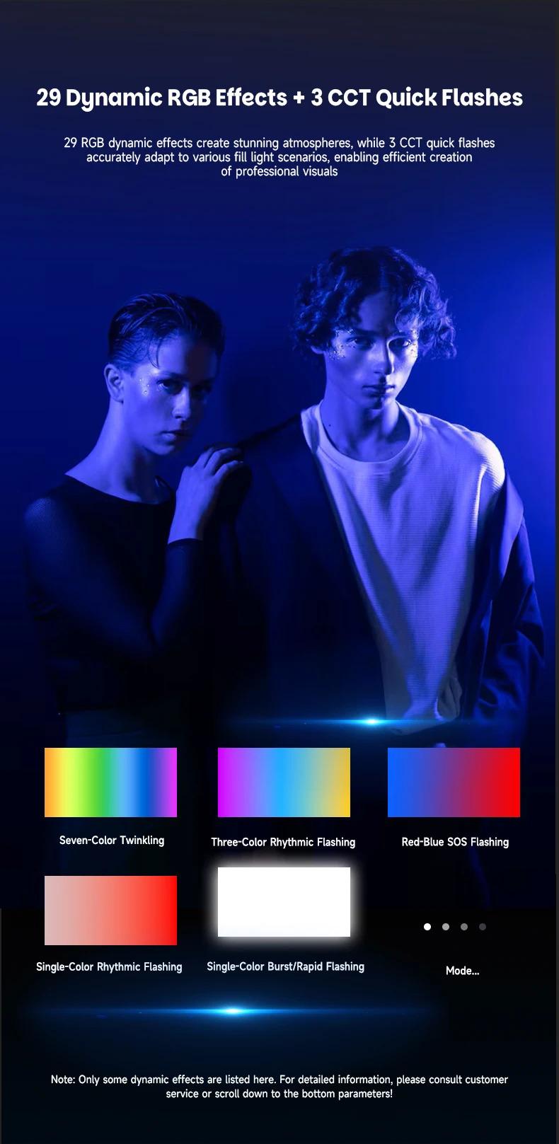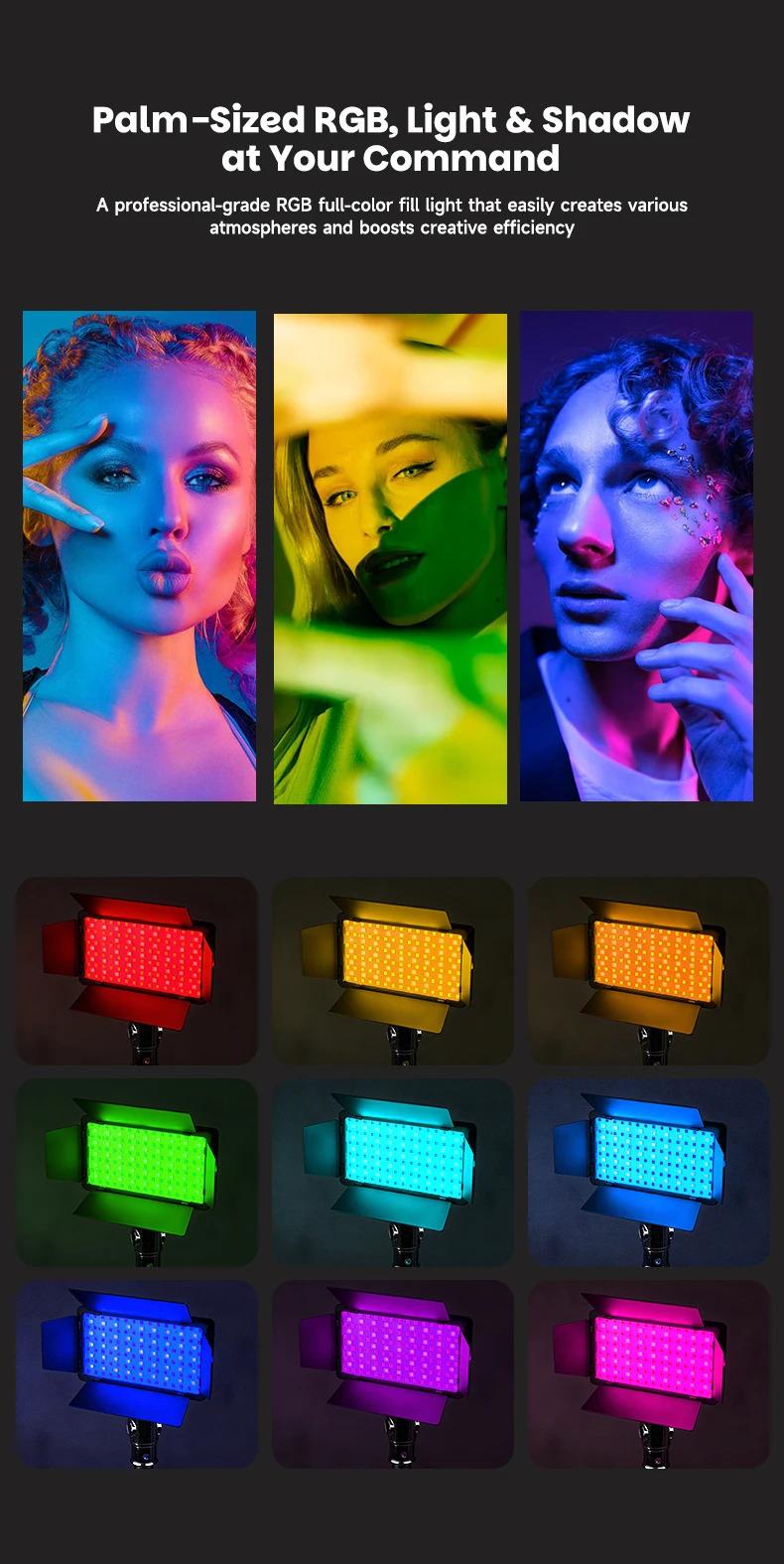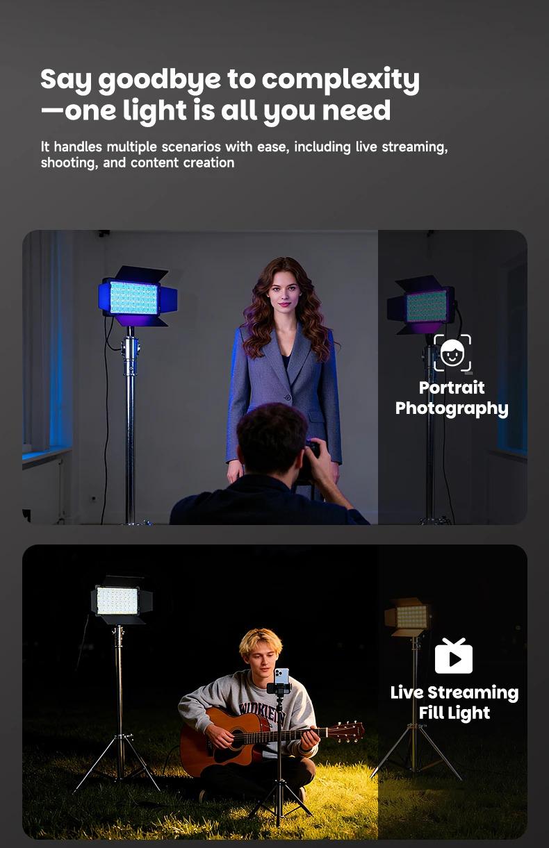 [Upgraded Dimmable RGB Light]With an upgraded lighting control system (constant 50W output with no color shift), the video light eliminates the minimum brightness limit, allowing 0-100% dimming range with 1% precision, delivering up to 7000lx/0.5m for professional studio photoshoot. 3200K-5600K and 360° full RGB spectrum ensure smooth, precise adjustments. Ideal key or soft fill light equipment for continuous output, it maintains consistent power and brightness when adjusting color temperature