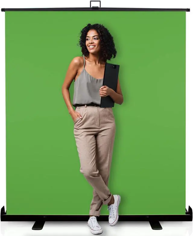 khomo gear jumbo size 55" x 82" green screen collapsible pull-up extra large streaming portable backdrop setup with auto-locking frameCollapsible green screen - The Green Chroma key screen rolls up and extends tightly for a smooth and wrinkle-free backdrop - The screen can be collapsed into itself to form a durable, hard aluminum case for easy storage - the sturdy X-FRAME automatically keeps your screen locked to the desired height - simple design for easy set up and use: Just open the case and pull up the screen using the built-in handle - perfect for Twitch & YouTube streaming