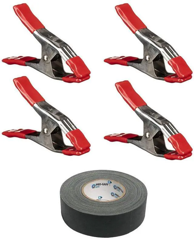 The bundle also includes a roll of Pro Tapes Gaffer Tape, a reliable, non-slip adhesive solution that complements the clamps' functionality. Whether you're working on a DIY project at home or handling professional tasks on a job site, these steel spring clamps offer the perfect blend of durability and versatility. The bright orange handles not only provide an improved grip but also make the clamps easy to locate among your tools. With these clamps and gaffer tape at your disposal, you'll be well-equipped to handle a wide range of clamping and securing tasks.