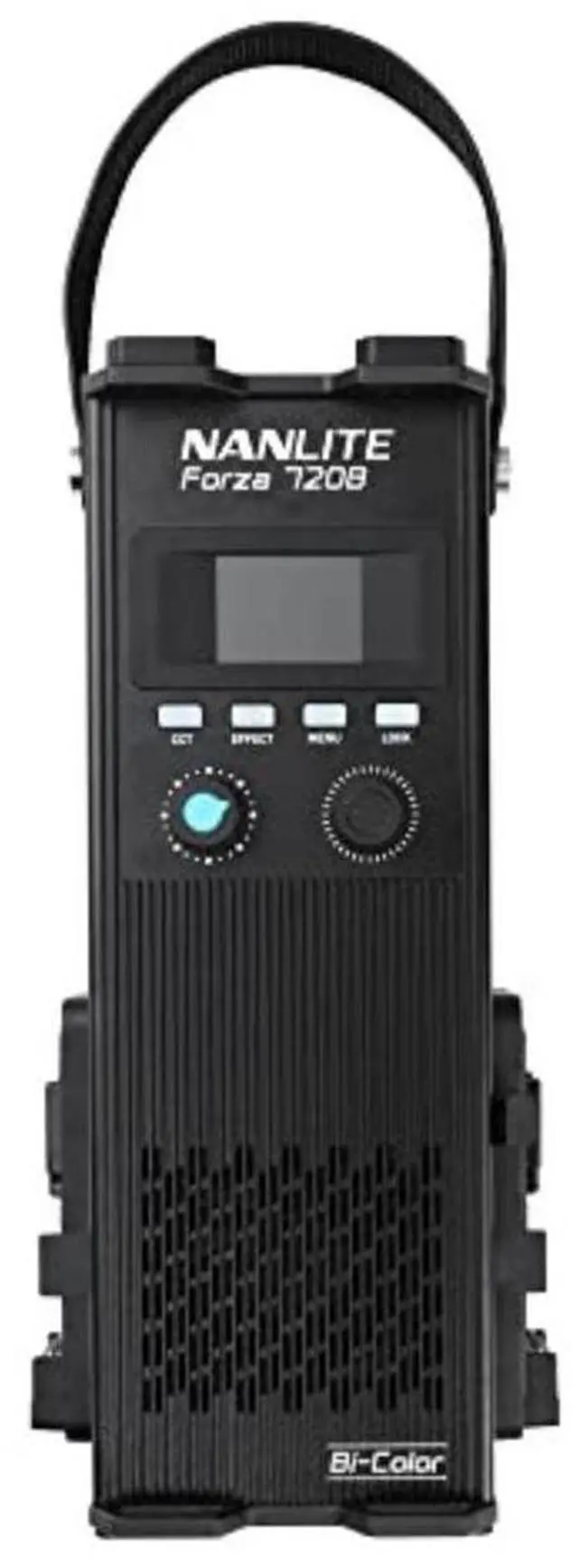 Designed for studio quality lighting on the road, the Forza 720B Bi-Color LED Monolight with Rolling Case from Nanlite is made to fill production roles usually handled by powerful HMI lights in a much more lightweight, compact, and heat-efficient package, with the added benefit of adjustable bi-color control. The COB LED component can deliver an immense amount of accurate colors with high CRI and TLCI ratings. It has a rated power of 800 watts, while being nimble enough to dim from 0 to 100% in 0.1% increments. It offers a suite of wireless control options for single lamp operation or more complex multi-light setups. 12 built-in practical effects can create complicated lighting scenarios in seconds and they can be customized and saved as recallable presets with the free NANLINK mobile app.