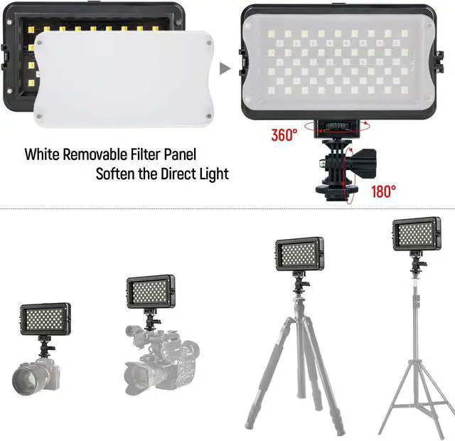 With hot shoe mount and universal 1/4" thread on the bottom, light can be attached directly to camera, tripod, light stand and so on. Portable size is great for to putting anywhere, run-and-gun shooting or event.