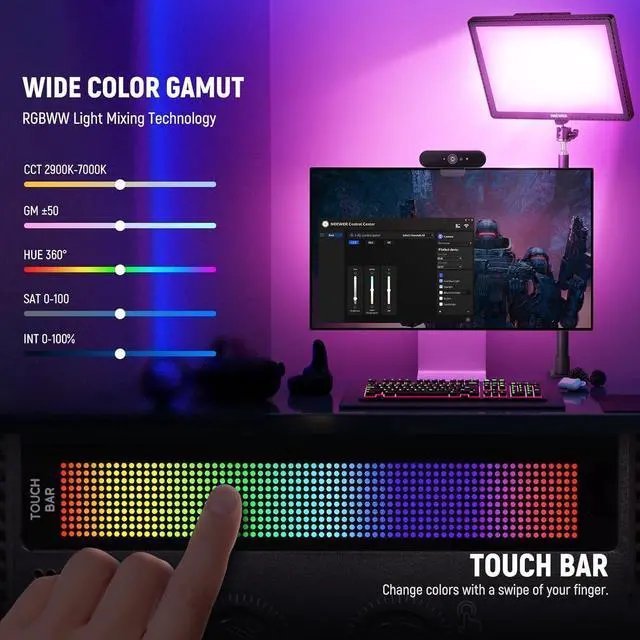 Edge Emitting Soft Illumination With 48W power, 144 LED bulbs, 4300lux/ 0.5 m maximum illuminance, and edge emitting technology, this GL1C light for live streamers produces soft lighting without flickers. High CRI 97+ ensures accurate color reproduction and comfortable lighting to the eyes. It is an ideal fill light for TikTok/YouTube or other social media influencers, content creators to record videosFull Colors Touch Bar & 18 Special Scenes With RGBWW light mixing, the computer lighting enables 2900K-7000K color temperature adjustment and ±50 GM color correction. In HSI mode, tones, saturation, and intensity are independently adjustable to get 36000 colors.
