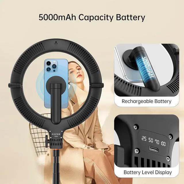 Fast Charging, Long Battery Life: Upgraded tripod with ring light features a built-in 5000mAh battery, a full charge provides 1.5-10 hours of continuous use, enough to complete the entire live stream or filming task. Recharge easily with laptop, wall adapter, or any power bank. Whether indoors or outdoors, say goodbye to tangled wires and battery anxiety!