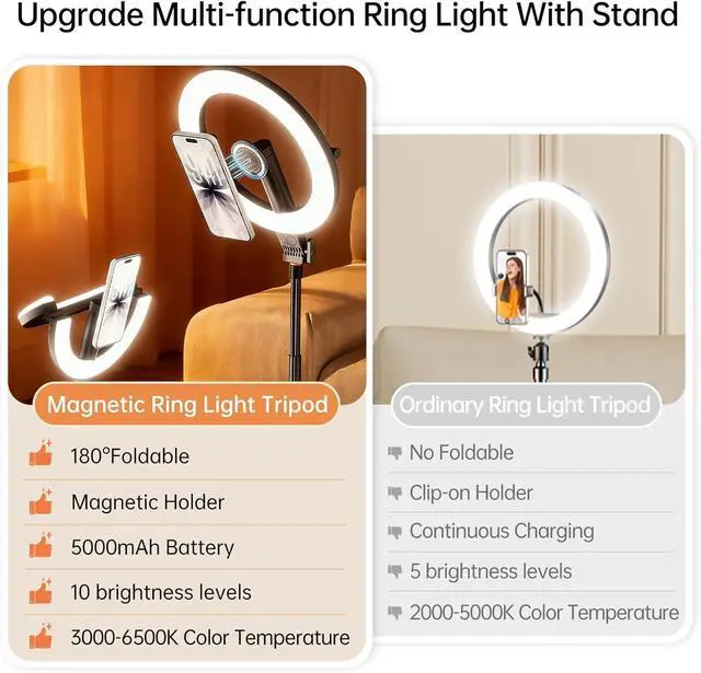 Upgrade Multifunctional Ring Light Tripod: This all-in-one ring light with stand combines portability, stability, and versatility, making it ideal for content creators. Efficient magnetic holder, long-lasting battery life, flexible height, and auto-pop-up make it easy to install and use. It can be used for handheld selfies, live stream, desktop photography, night lighting, and easily responds to different scenarios.