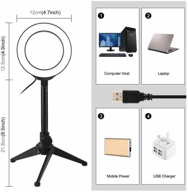 The USB ports can be used with multiple devices, such as connect computer host, laptop, mobile power and USB charger. You will be able to enjoy LED ring light at any time free.