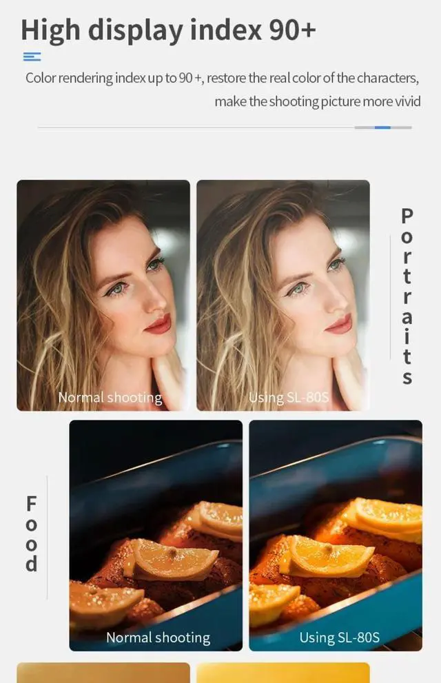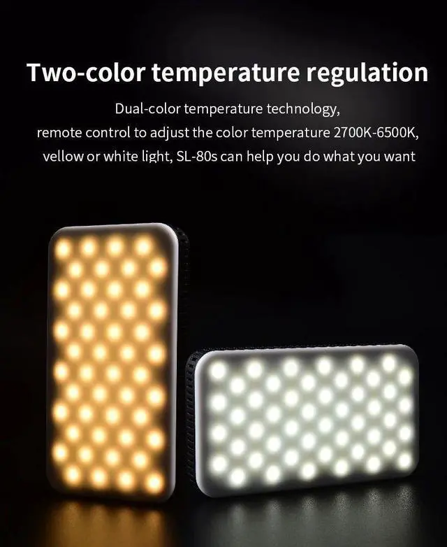 --Adjustable Color Temperature and Brightness: Dual color temperature technology, sl-80s can help you do what you want likelivestreaming, news interview, vlog, etc. Cold and warm lightbrightness can be adjusted.