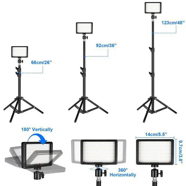 • Adjustable Height and 180° Rotation Angles: The light stand can be attached directly to the light panel and extended from 26 inches to 48 inches. With a cold shoe ball head, the light panel can be rotated 180° vertically and 360° horizontally. You can adjust the viewing angles to suit your needs.