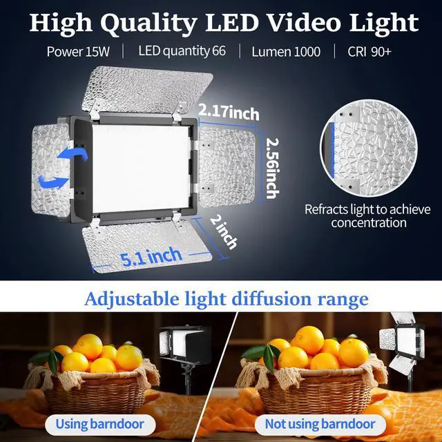 Excellent LED Bulbs & USB PoweredThe LED panel light is equipped with 66 pcs LED energy-saving lamp beads, CRI 90+, 800lm, 5600k. The barndoor to which the panel light is attached and the uneven design on it shape the light, preventing spillage and providing more focus. Designed with a convenient USB plug, you can always plug it into your mobile power supply, desktop PC, charging plug or your USB socket. Use with 5 V, 2 A power charger for better brightness