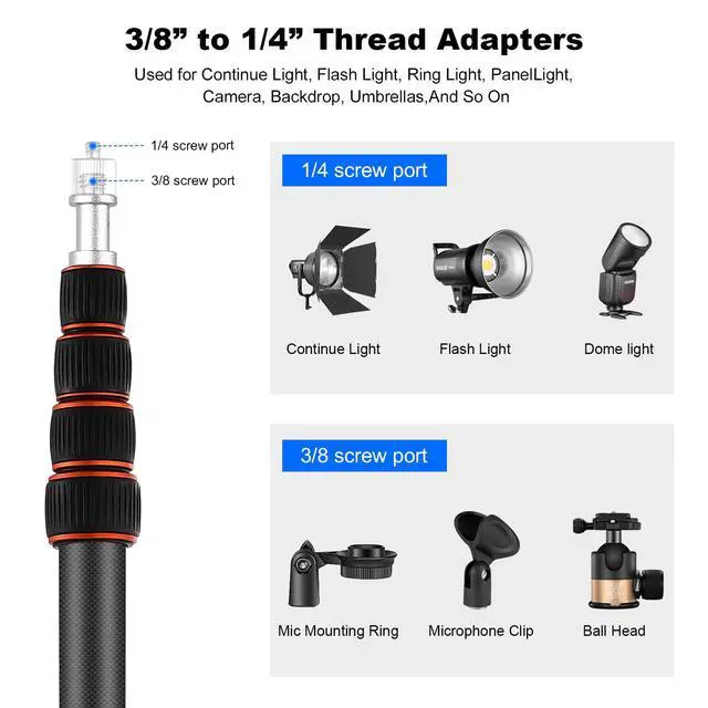 Amplia compatibilidad:equipado con un adaptador de tornillo reversible de 1/4 a 3/8 pulgadas,este trípode es compatible con una amplia gama de dispositivos,incluyendo cámaras DSLR y sin espejo,luces de anillo,luces de panel LED,luces estroboscópicas,cámaras de acción y mucho más.