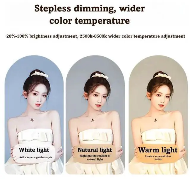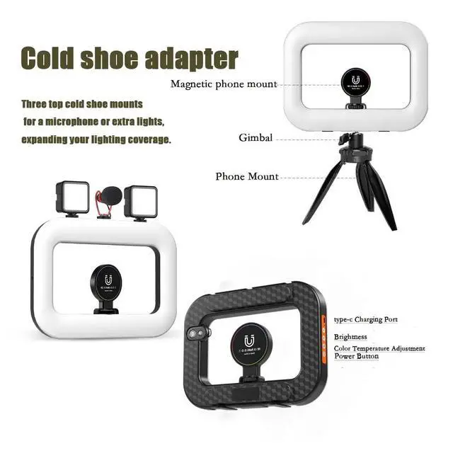 Description: Portable and Lightweight: This selfie light for phone is easy to carry and wont add extra burden to your phone Adjustable Brightness: The cell phone fill light allows you to adjust the brightness according to your needs for selfie lighting Compatible with All Phones: This phone flashlight is compatible with a wide range of mobile phone models for versatile use Three-color Temperature Adjustment: Achieve the lighting effect with three adjustable colors on this selfie light 8000mah HA Battery: Enjoy long-lasting lighting with the built-in 8000mah HA battery of this phone selfie light Specification: Material: ABS. Note: There might be a bit color distortions due to different computer resolutions. There might be a slight errors due to different hand measurement. Package Includes: Handheld circular light + handheld tripod + universal head + mobile phone holder