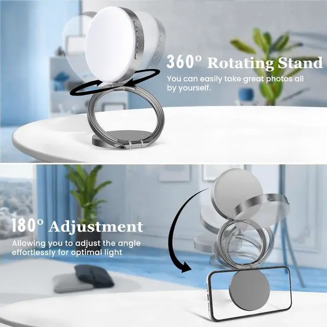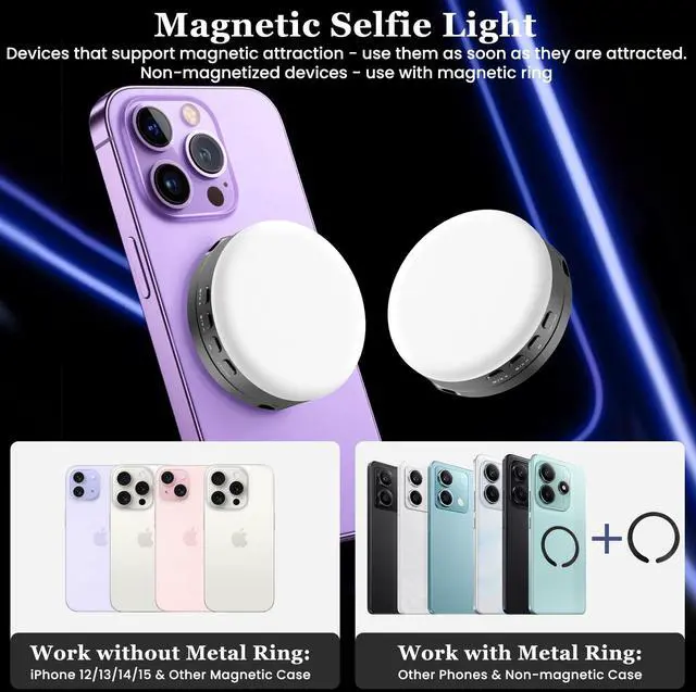MAGNETIC CLICK-&-GO DESIGN - Instantly attach to any magnetic surface with 4 built-in super-strong neodymium rings! Perfectly compatible with all magnetic devices (iPhone 12-16 series, iPads, laptops, etc.). No clamps, no adhesives just snap it on and shine anywhere. Your ultimate go-anywhere lighting solution.