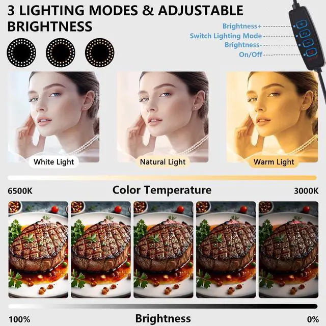 • Diverse Light ModesWith white light, natural light, and yellow light modes, the ring light can have its color and brightness adjusted according to the shooting content, ensuring accurate and natural colors in photos and videos