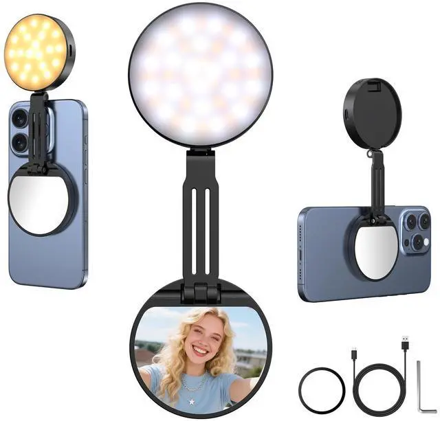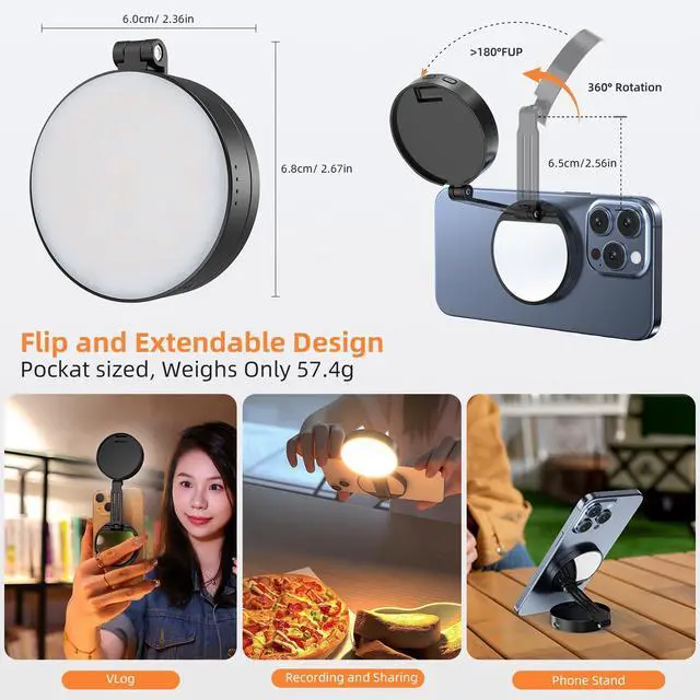 Built-in Makeup MirrorThe selfie light for iphone has a built-in 58mm high-definition makeup mirror which can be paired with the fill lighting, enabling quick touch-ups anytime, anywhere. The magsafe magnetic selfie light makes daily grooming and on-the-go adjustments effortless, whether reapplying lipstick during a subway transfer, fix loose hair before a cafe selfie, or nail perfect lighting for livestreams and vlogs