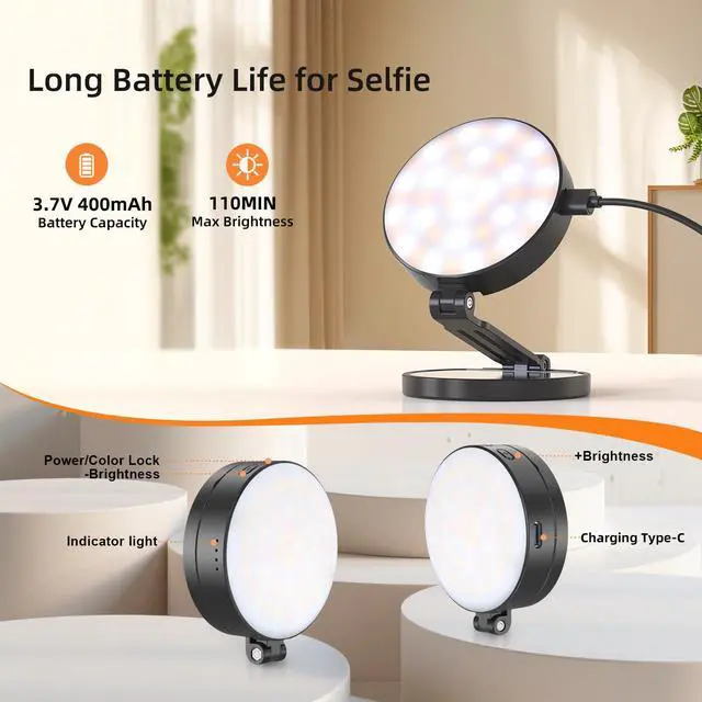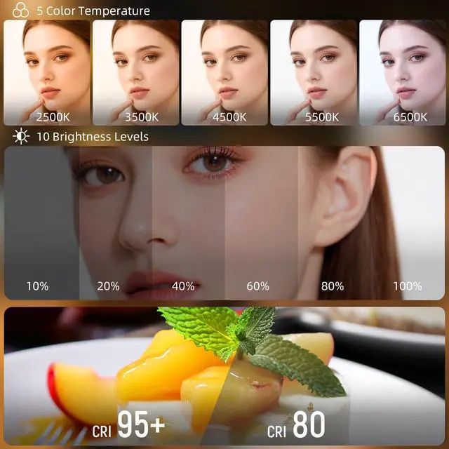 Adjustable Brightness and Color TemperatureThis portable LED cell phone selfie lights offers 5 adjustable color temperatures (2500K/3500K/4500K/5500K/6500K) and 10%-100% stepless dimming, all easily controlled via buttons. With a high color rendering index of 95+, it delivers professional-grade lighting that reproduces natural-looking skin tones. The soft, even light easily brightens your face and reduces shadows, ensuring you camera-ready anytime, anywhere